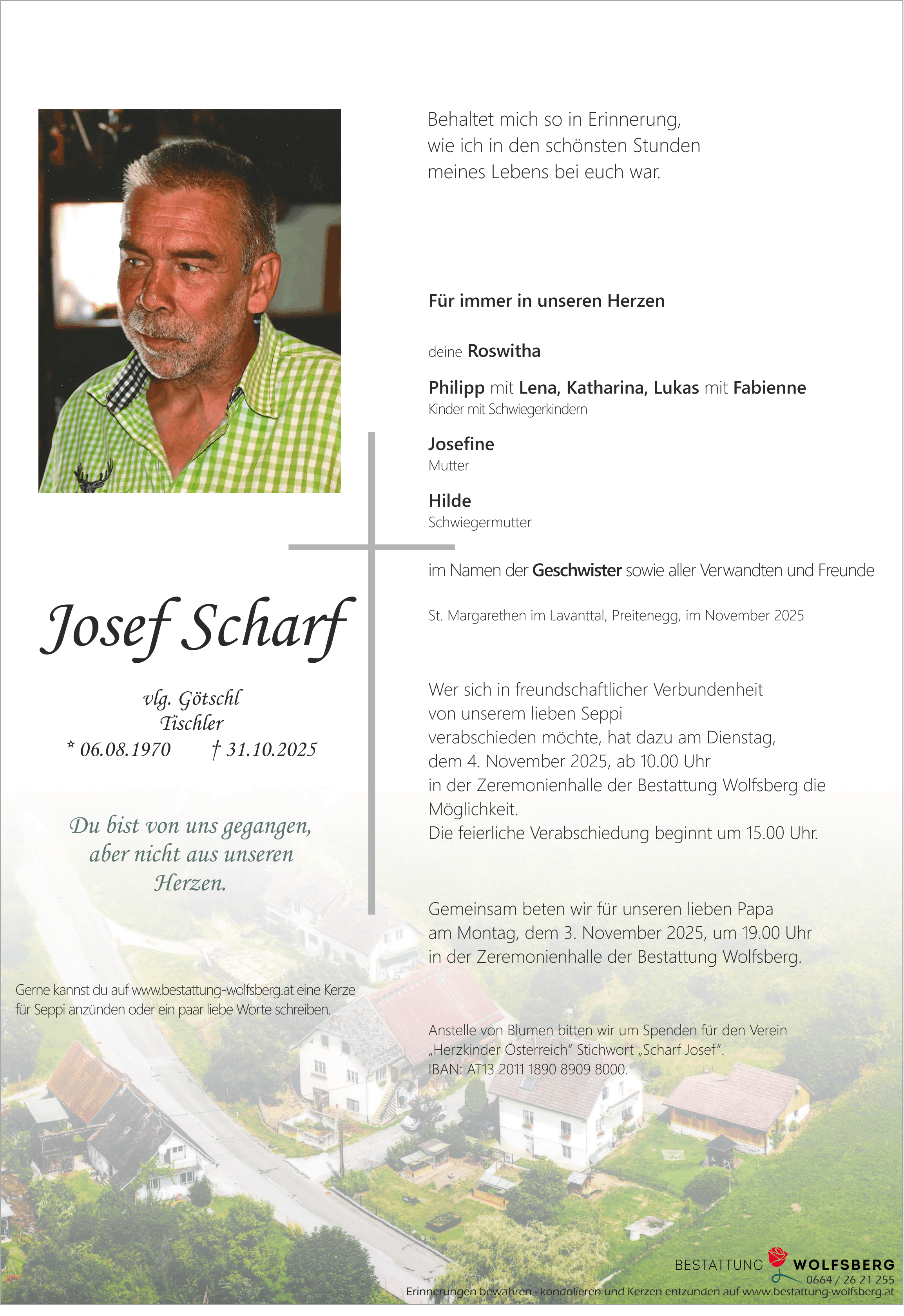 - Wer sich in freundschaftlicher Verbundenheit von unserem lieben Seppi verabschieden möchte, hat dazu am Dienstag, dem 4. November 2025, ab 10.00 Uhr in der Zeremonienhalle der Bestattung Wolfsberg die Möglichkeit.