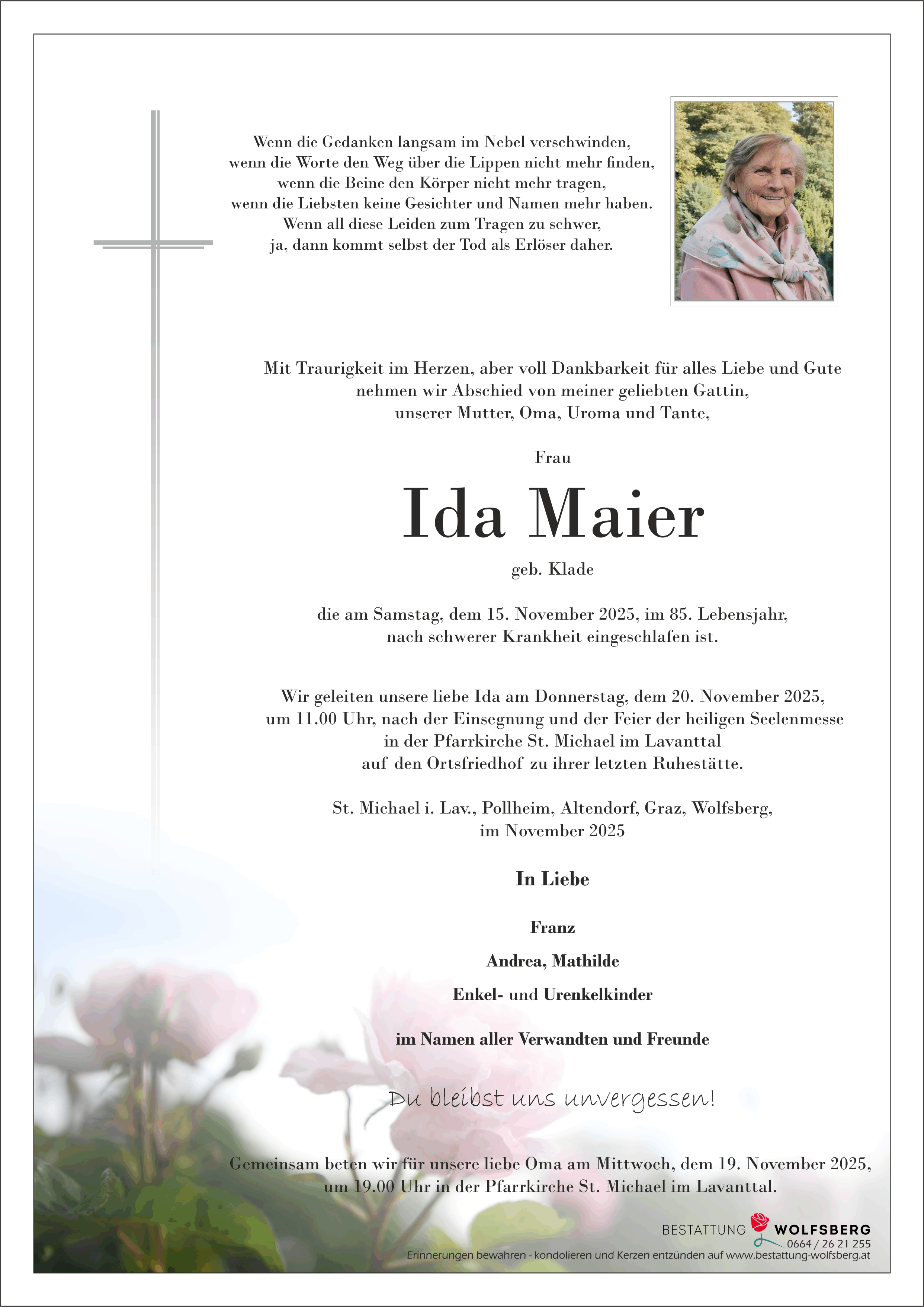Liebe Trauerfamilie Mit großer Traurigkeit erfüllt uns die Nachricht vom Ableben unseres Mitgliedes Ida Maier. Genau 25 Jahre war unsere Ida Mitglied des Pensionistenverbandes und 20 Jahre davon erhellte ihre Stimme das Pensionisten heim. Ihre Fröhlichkeit und Liebenswürdigkeit wird uns fehlen. Wir werden Ida in lieber Erinnerung behalten Max Koschu -Obmann