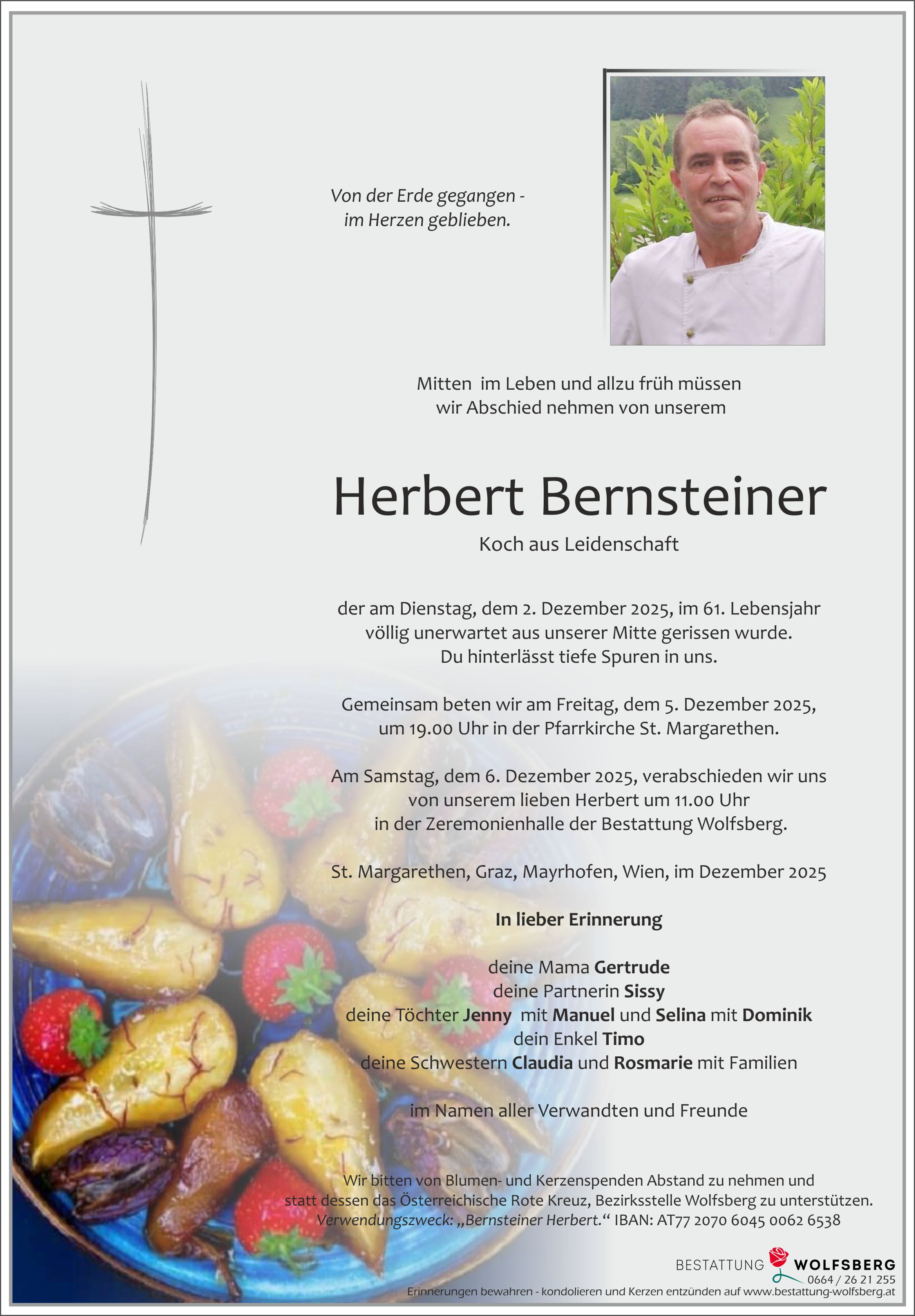 Mein Herbert Danke für unsere gemeinsame Liebe und für das Vertrauen, das wir einander geschenkt haben, für die Freude, die zwischen uns gewachsen ist, und für die Pläne, die wir gemeinsam hatten. Ich trage sie weiter, als Teil von uns, der nicht endet, nur eine andere Form findet. Du fehlst mir in jedem Moment, und zugleich bleibst du in mir: in unserem Lachen, in den Gesprächen, die noch in mir nachklingen, und in der Art, wie wir einander gesehen haben. In Liebe, Sissy