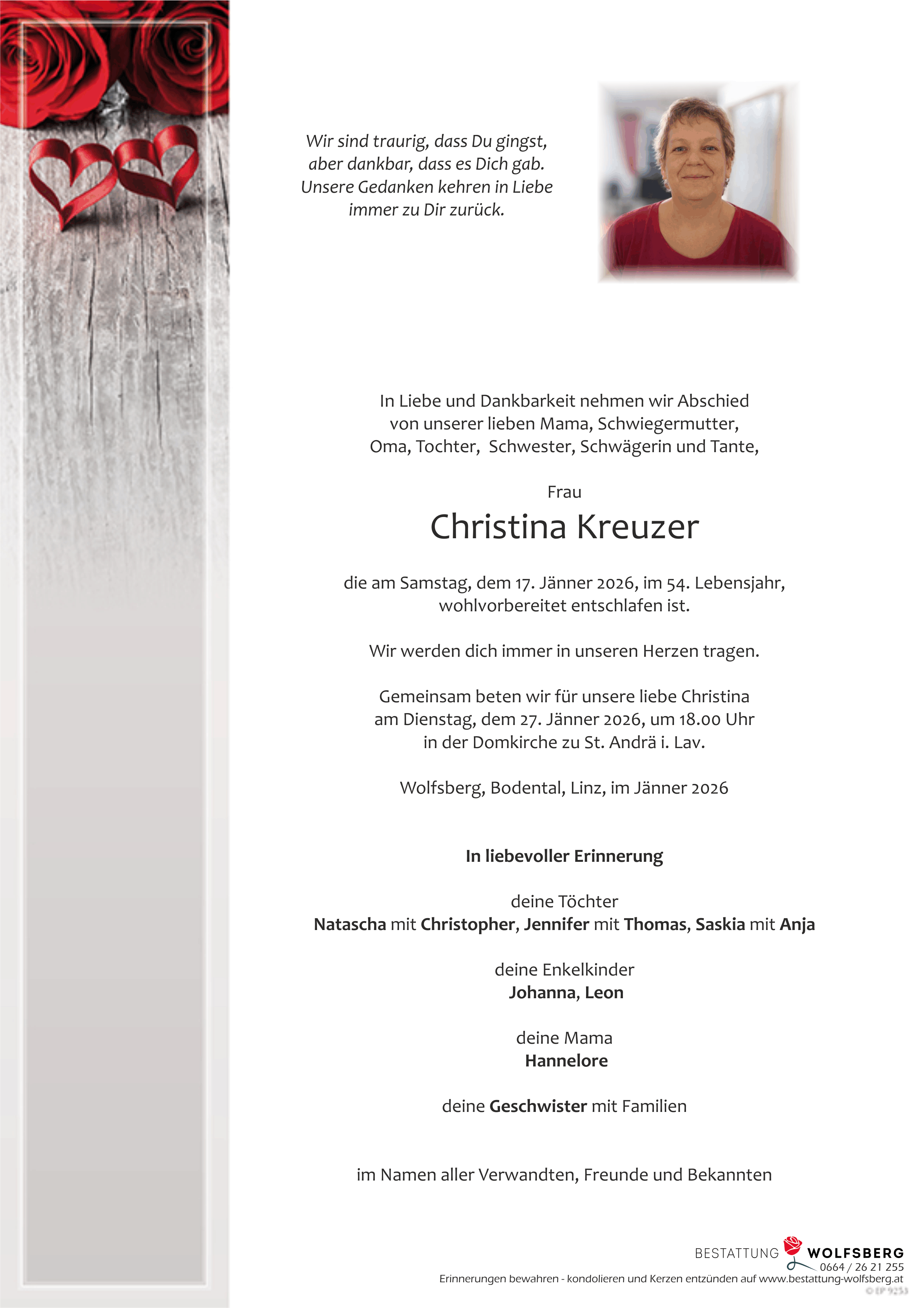 Liebe Christina ich wünsche dir eine gute Reise. War ganz schockiert wie ich die Nachricht erfragt habe .Liebe Natscha Jenny und Saskia viel Kraft in den schweren Stunden .Christina wird jetzt der Abendstern für euch leuchten. Wie ihr wisst hat Christina gekämpft sie war sehr stark aber ihre Kräfte gingen leider am 17 Jänner aus.