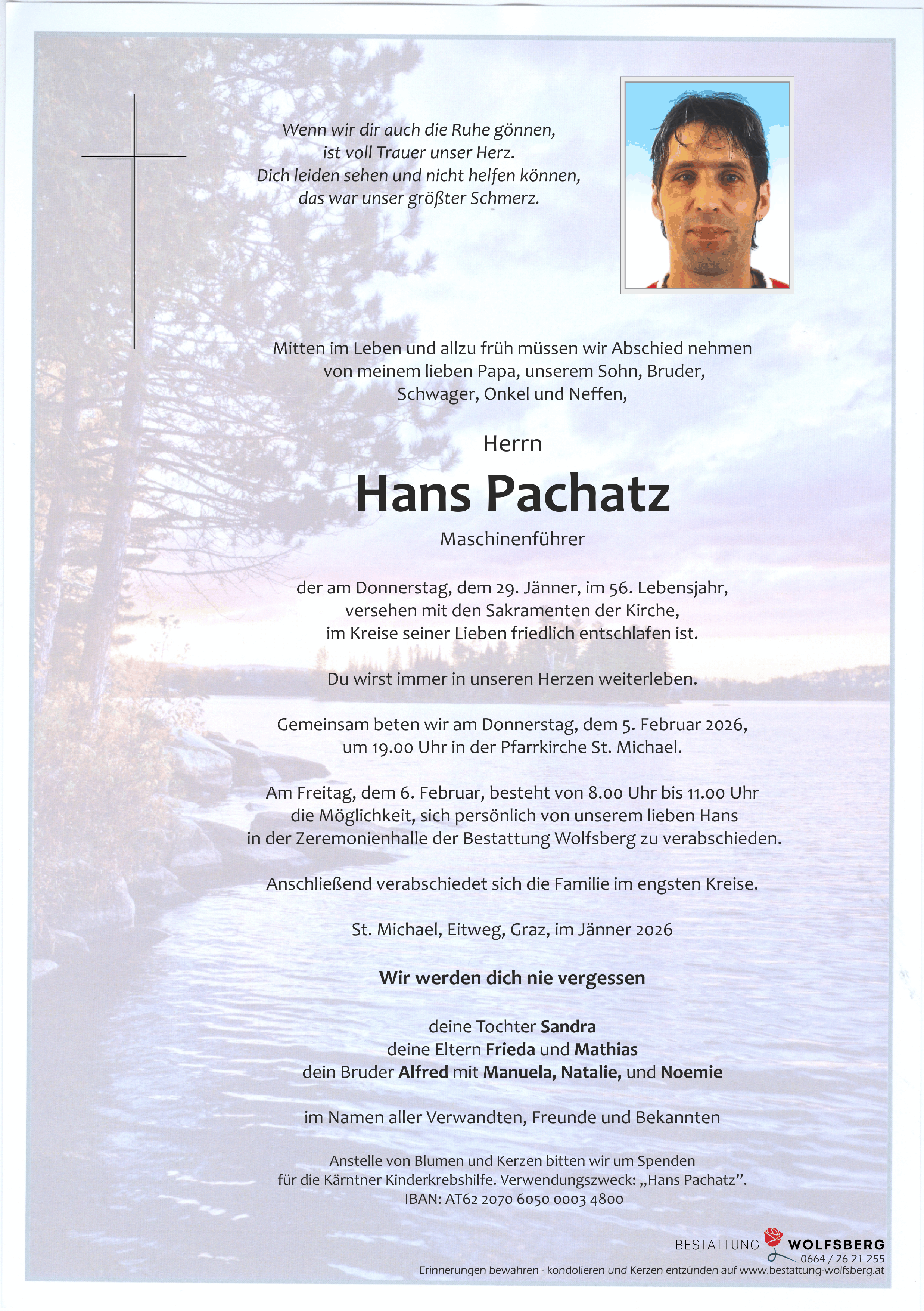 Liebe Trauerfamilie! Tief betroffen haben wir vom allzu frühen Tod unseres ehemaligen Arbeitskollegen erfahren. Seine Ehrlichkeit und Zuverlässigkeit und seine Bodenständigkeit werden uns in guter Erinnerung bleiben. „Wenn ihr mich sucht, sucht in euren Herzen. Habe ich dort eine Bleibe gefunden, lebe ich in euch weiter.“ (Rainer Maria Rilke) Wir bedauern Euren Verlust zutiefst und sprechen Euch unsere aufrichtige Anteilnahme aus. Anita & Herbert & Thomas Maitz