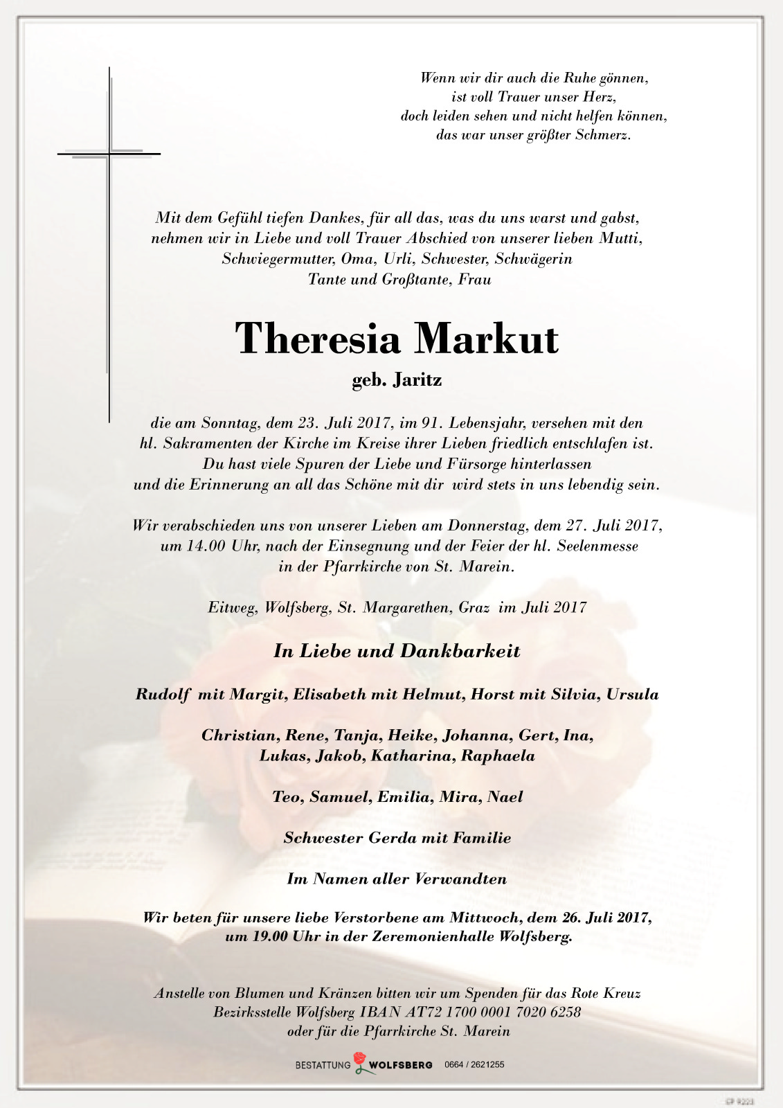 Aufbahrung: 26.07.2017 um 13.00 Uhr in der Zeremonienhalle Wolfsberg