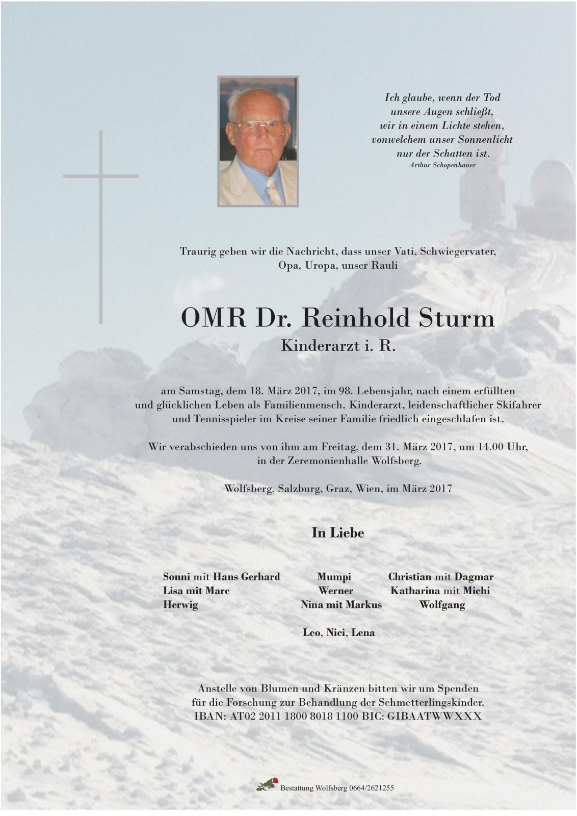 Aufbahrung: 31.03.2017 um 13.00 Uhr in der Zeremonienhalle Wolfsberg