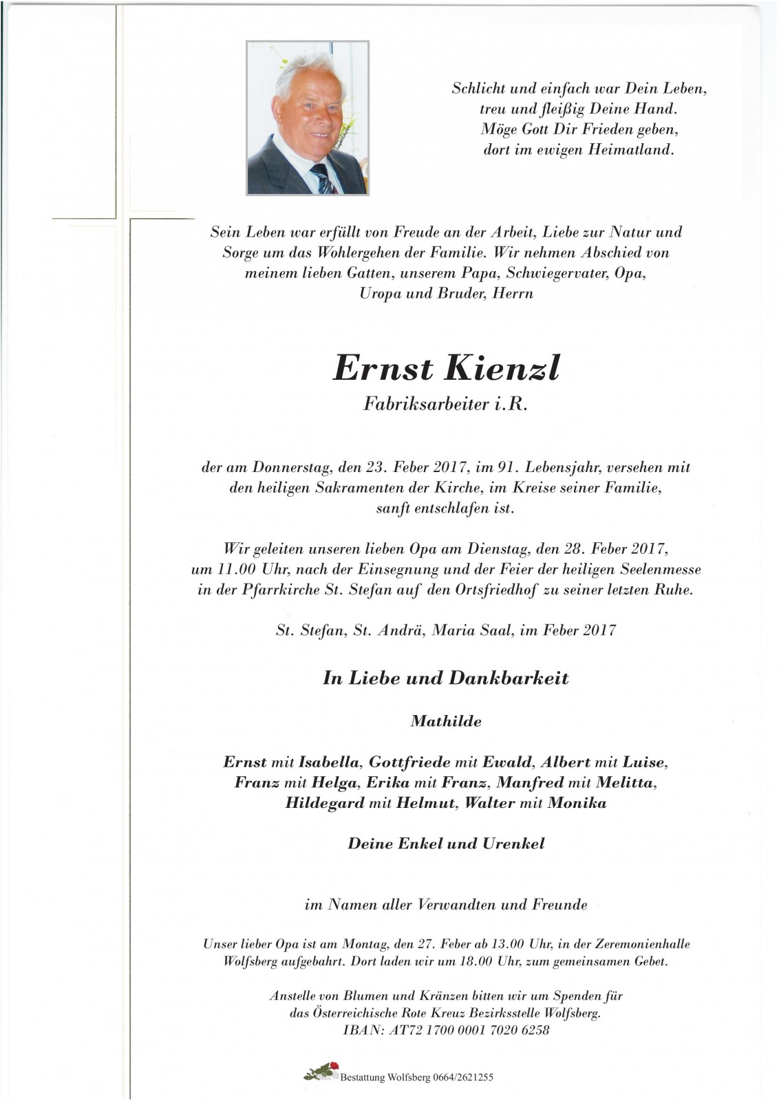 Aufbahrung: 27.02.2017 um 13.00 Uhr in der Zeremonienhalle Wolfsberg